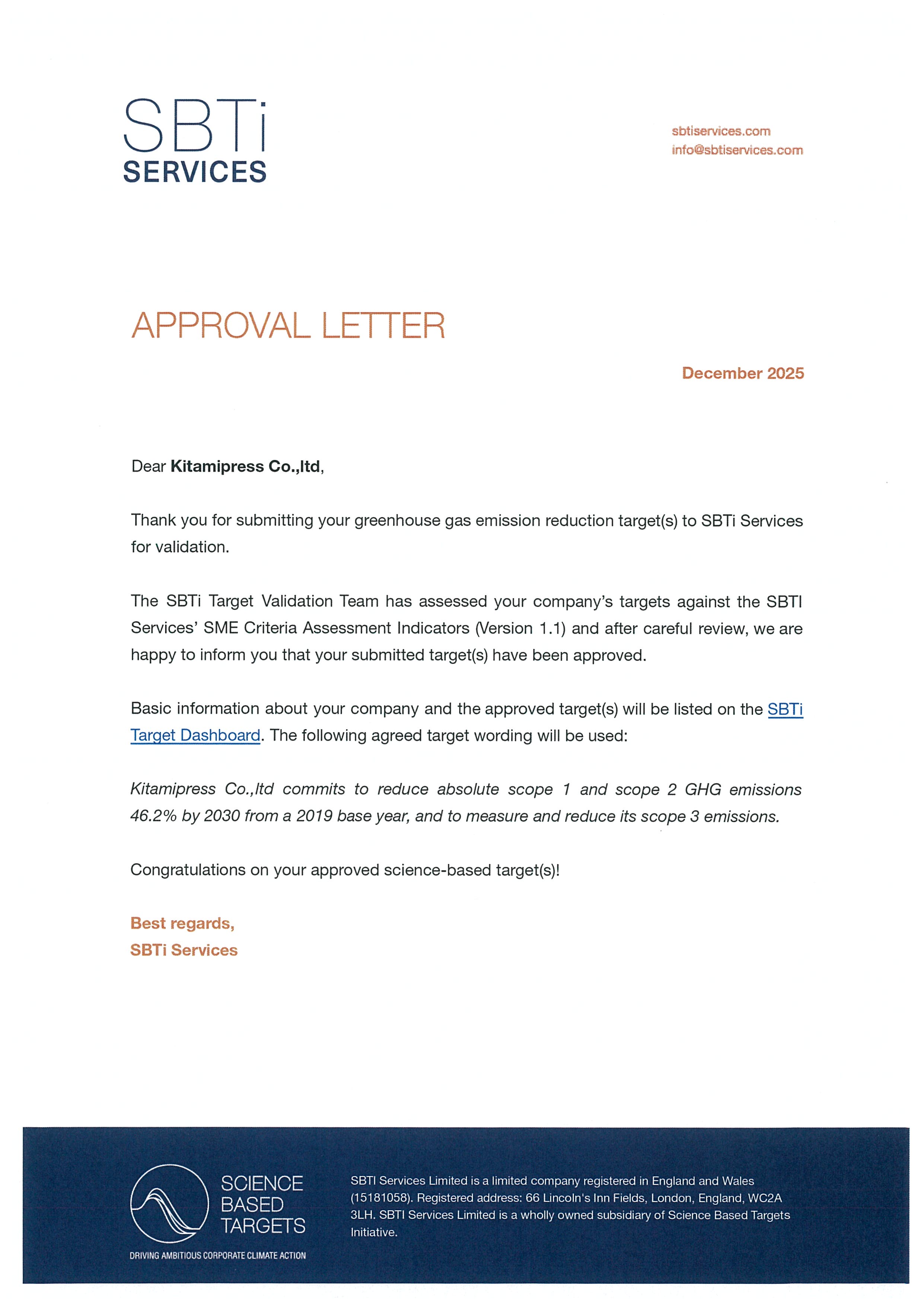 北見プレス㈱は、中小企業(SME)向けSBT(Science Based Targets)認定にて、温室効果ガス排出量を2019年度比で2030年度までに総排出量の46.2%を削減する目標を設定し、2025年12月にSBTの認定を取得しました。